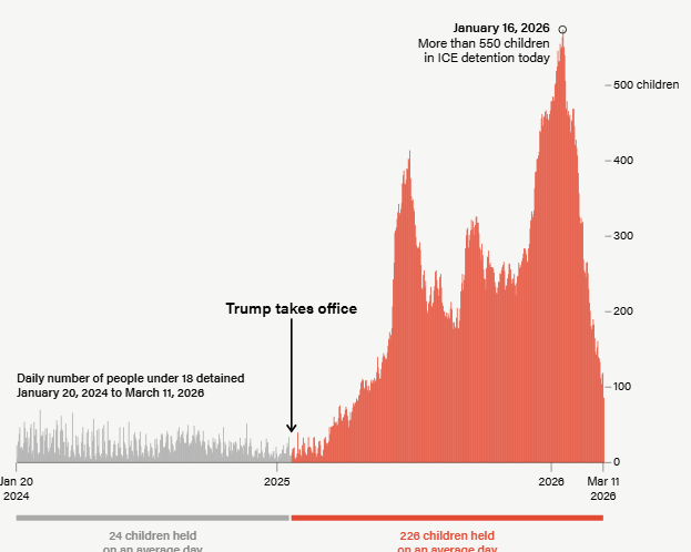 About a month into President Trump’s second term, the number of children held by ICE each began growing to a peak of more than 550 in January of this year, then declined sharply, to fewer than 90 in mid-March. Data after that relative low point has not yet been made available. Despite the drop, lawyers for detained children told The Marshall Project conditions remain bleak, with their clients frequently suffering mental and medical distress.